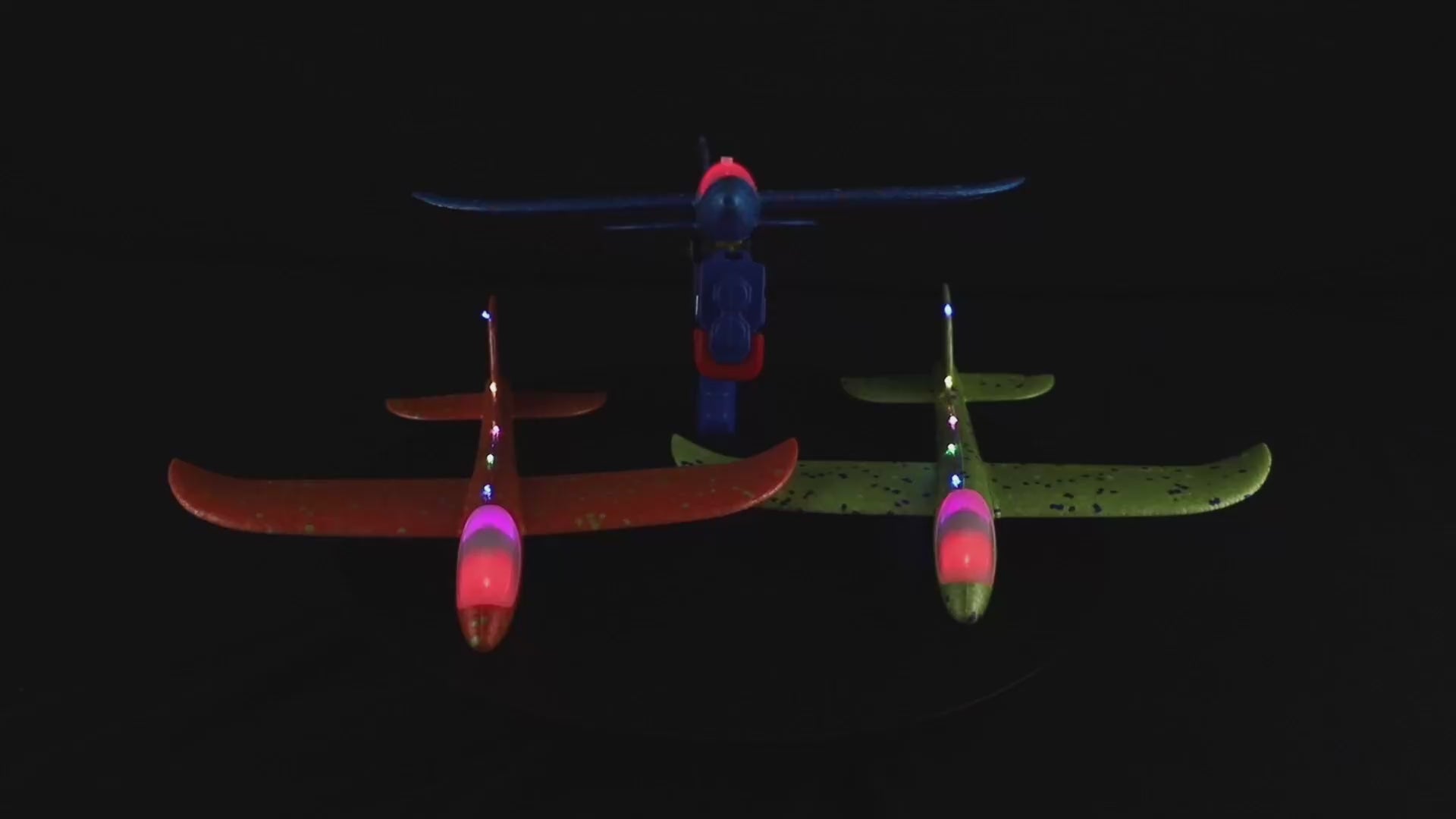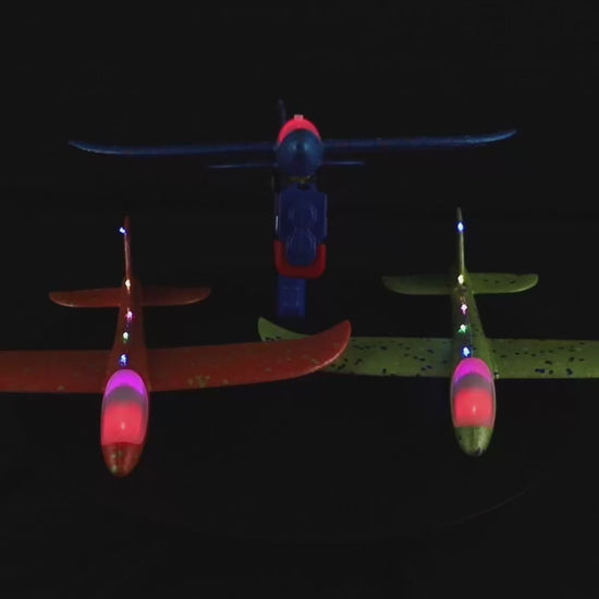 - Foam planes feature built-in LED lights that can be switched on for dusk or nighttime launching.