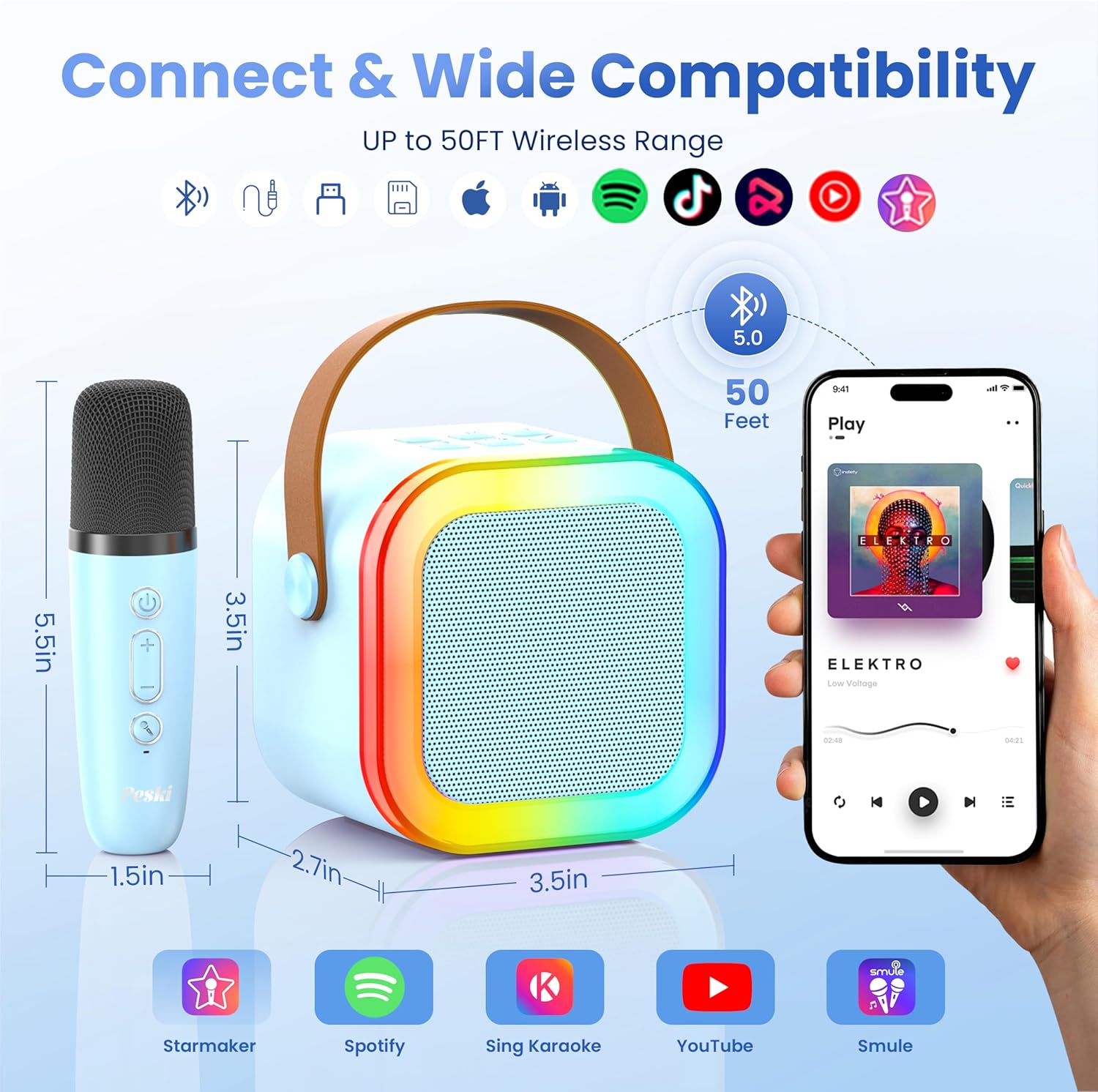 - Works as a portable Bluetooth speakerâconnect a phone, tablet, or laptop to play favorite songs or YouTube karaoke tracks.